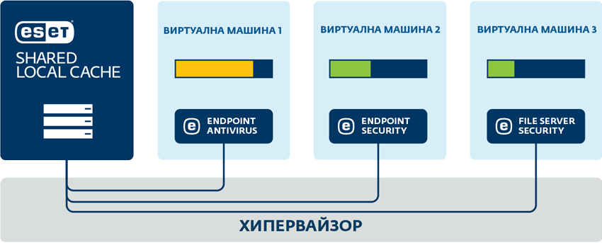 Виртуалните машини често използват еднакъв базов image файл, което значи, че 70-80% от файловете на различните машини са еднакви. ESET Shared Local Cache съхранява метаданните на предишно сканирани файлове, които имат общ хипервайзор. Това ви позволява да избегнете сканирането на еднакви файлове между виртуалните машини, в случай, че те са потвърдено безопасни и значително ускорява сканирането.