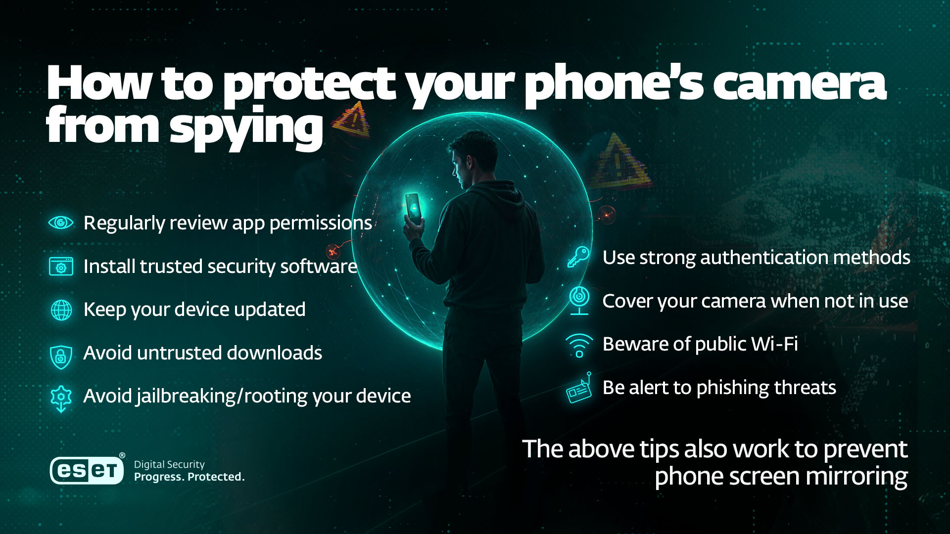 Install security software from a trusted provider, revoke excessive app permissions, keep the device and apps updated, and avoid downloading apps from third-party marketplaces. Also, be phishing-aware, avoid public Wi-Fi, don’t jailbreak/root your device, use biometric authentication, and cover the camera when not in use.