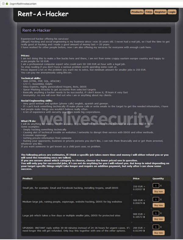 Serviços de hacking: os agentes se promovem destacando habilidades técnicas e conhecimentos em diferentes linguagens de programação. Alguns dos produtos oferecidos incluem acesso a explorações de dia zero e todos os tipos de gadgets para cometer um ataque de computador, invasão a sites, organizações, telefones celulares, e-mails ou redes sociais.