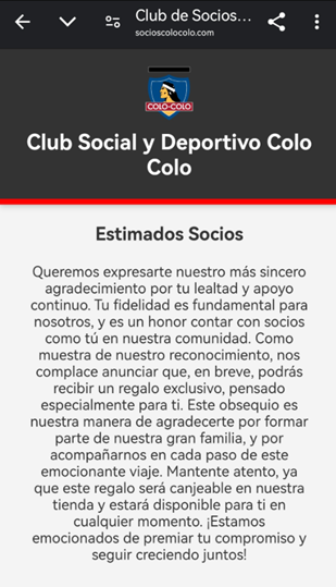 Recentemente, o clube Colo-Colo, do Chile, também foi explorado por cibercriminosos para aplicar golpes. Em abril de 2025, diversos usuários relataram na rede social X uma campanha de phishing enviada por e-mail que se passava pela instituição para enganar os sócios. A mensagem prometia um presente como forma de recompensar a fidelidade dos associados e oferecia a possibilidade de resgatar camisetas, uniformes do clube e outros itens, bastando pagar apenas o valor do frete. No entanto, o verdadeiro objetivo era obter os dados de pagamento das vítimas.