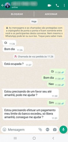 Em posse desse código os criminosos conseguem registrar o WhatsApp da vítima em outro aparelho e, por exemplo, realizar os golpes do primeiro item desta lista. As desculpas usadas pelos criminosos são as mais variadas. Veja dois exemplos: