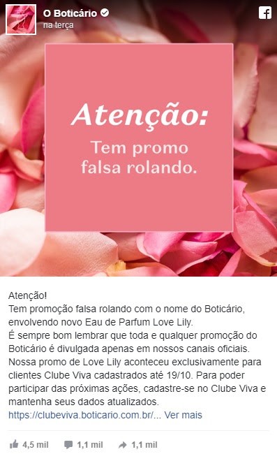 Nas redes sociais, a empresa O Boticário fala sobre a promoção falsa e alerta os usuários sobre a fraude: