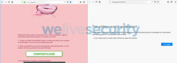 Sempre que as vítimas clicam no botão “compartilhar” uma URL que possui um link de compartilhamento do WhatsApp é aberta. Logo em seguida, o app é aberto na tela de compartilhamento de mensagens.