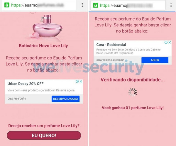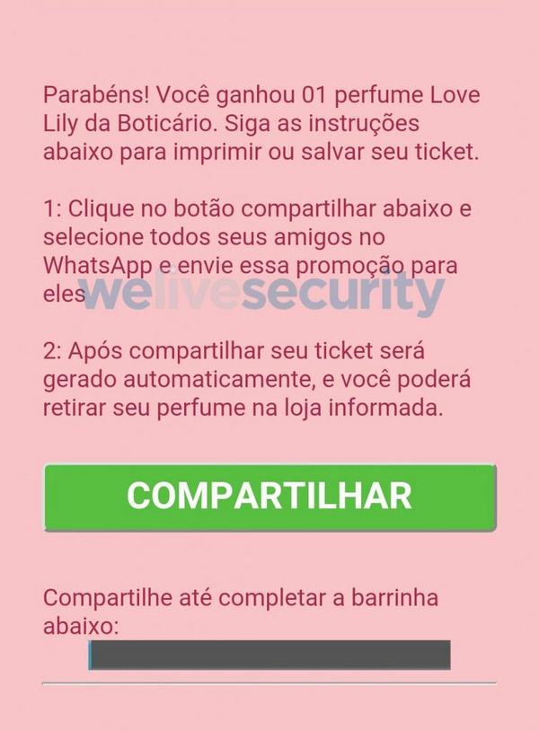 Conforme a ESET, empresa líder em detecção proativa de ameaças, alerta, a falsa campanha faz uso de Engenharia Social e se propaga por meio de um link que é enviado pelo WhatsApp, com a promessa de que o usuário receberá um perfume da empresa caso siga todas as instruções.