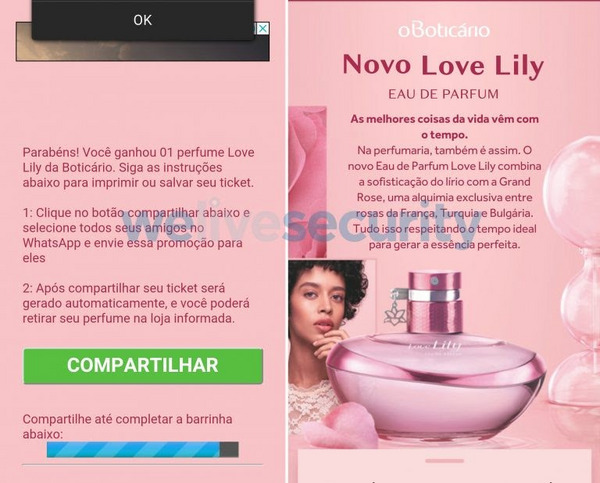 Independentemente da vítima compartilhar o link ou não, a barra de progresso do site malicioso avança. Quando o botão “compartilhar” é pressionado pela décima vez, a vítima é redirecionada ao site da empresa O Boticário, especificamente para uma página de solicitação de amostras grátis do perfume Love Lily.