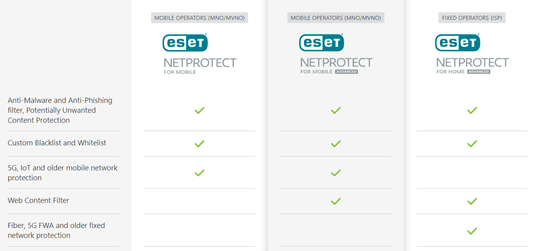 A nova oferta inclui o ESET NetProtect Mobile e ESET NetProtect Mobile Advanced, que oferecem segurança por meio de redes móveis, e o ESET NetProtect Home Advanced, que ajuda a resguardar as conexões de rede fixa. Estes protegem os dispositivos dos usuários conectados às redes Telco e ISP (fixas ou móveis) contra domínios web maliciosos ou categoriascomo malware, phishing e conteúdo potencialmente indesejado.