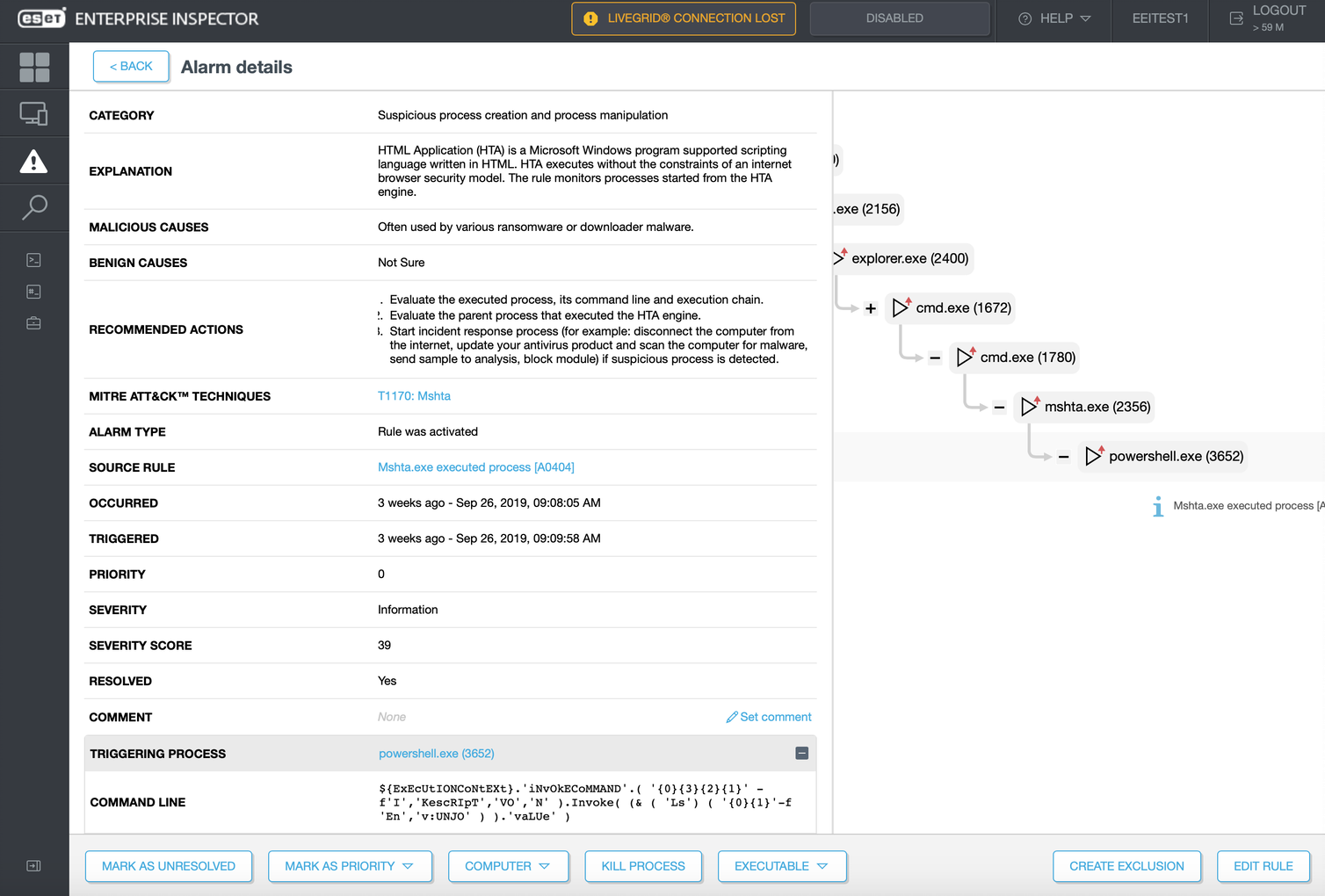 EEI works by matching event data from endpoints against a set of rules designed to flag malware-like or suspicious behavior, as well as low reputation and/or malicious executables. Matched events fire-off alarms and complete process trees are available for manual inspection in EEI: