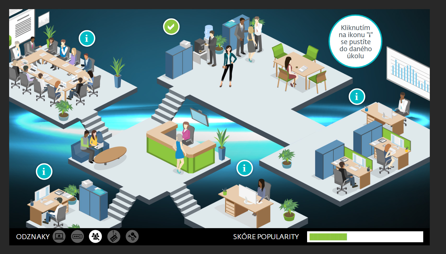 - Interaktivní herní prvky aktivně zapojují účastníka a pomáhají lépe si zapamatovat klíčové informace.