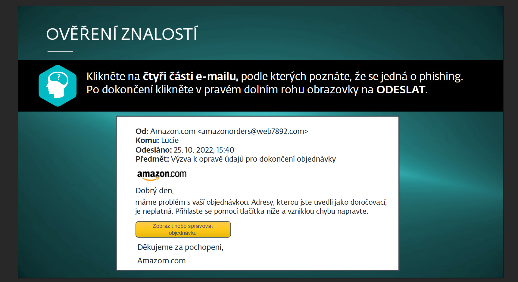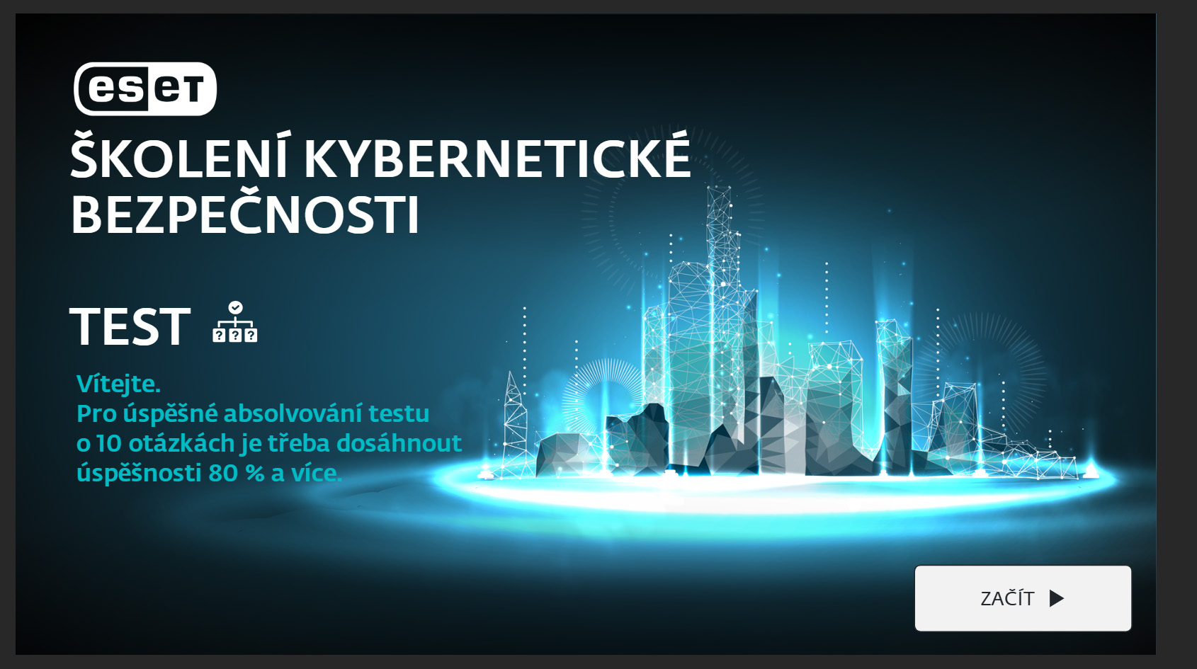 - Školení je ukončeno závěrečným testem, u kterého je potřeba dosáhnout 80% úspěšnosti.