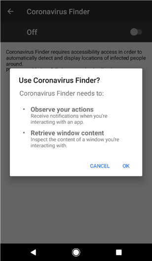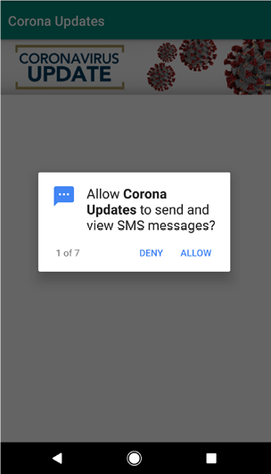 Ukázka podvodné aplikace s tématikou koronaviru. Aplikace si žádá příliš vysoká oprávnění