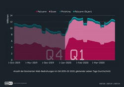 Im ersten Quartal stiegen die Web-Bedrohungen um 21 Prozent im Vergleich zum vierten Quartal 2019. Dieser Bereich umfasst verschiedene Formen von gefährlichen Webseiten für Internetnutzer. Es können bekannte Seiten sein, die durch einen Hackerangriff kompromittiert wurden und nun Schadcode beinhalten. Aber auch eigens von Kriminellen erstellte Internetseiten, die Schadcode verteilen oder betrügerische Inhalte besitzen. Darüber hinaus zählen zum Bereich Web-Bedrohungen Phishing-Seiten, die es gezielt auf sensible Daten der Besucher abgesehen haben. Insbesondere die Webseiten, die mit betrügerischen Inhalten befüllt werden oder Schadcode verteilen, haben im ersten Quartal massiv zugenommen.