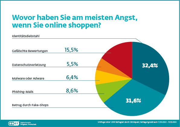 Identitätsdiebstahl, also der Diebstahl und Missbrauch der persönlichen Daten, um beispielsweise online Verträge abzuschließen oder Einkäufe zu tätigen, ist die größte Angst jedes dritten Internetnutzers. Werden Verbraucher Opfer dieser Diebe, bedeutet das viel Ärger und Stress, um den Missbrauch der eigenen Daten einzudämmen. Dicht dahinter folgt mit 31,6 Prozent der Betrug durch Fake-Shops. Täglich erscheinen neue Online-Shops, immer wieder sind auch Betrüger darunter. Fake-Shops machen meist mit Schnäppchen-Angeboten auf sich aufmerksam. Gerade bei Offerten, die zu gut erscheinen, gilt es misstrauisch zu sein. Ansonsten sind Geld und persönliche Daten weg. Auf Platz 3 folgt die Angst vor gefälschten Bewertungen (15,5 Prozent).