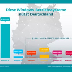 Windows-Betriebssysteme haben in Deutschland bei Desktop-PCs und Notebooks einen Marktanteil von rund 80 Prozent. Die gute Nachricht: Ein Großteil der eingesetzten Geräte nutzt das aktuelle Windows 10. Doch ein genauer Blick auf die Zahlen zeigt eine sehr bedenkliche Sicherheitslage: 5,2 Millionen Geräte setzen auf veraltete Windows-Versionen. Allein auf 4 Millionen Computern ist noch immer Windows 7 installiert, dabei endete der Support für das Betriebssystem seitens Microsoft vor gut einem Jahr. Und auf mehr als einer Million PCs ist Windows 8, XP oder Vista im Einsatz. Betriebssysteme, die bereits seit Jahren nicht mehr aktualisiert werden. Aufgedeckte Sicherheitslücken für diese Windows-Versionen werden nicht mehr durch Microsoft-Updates geschlossen und können von Cyberkriminellen ausgenutzt werden. Insbesondere das eingesetzte Betriebssystem ist eine wichtige Säule, um die Sicherheit des Gerätes und des gesamten Netzwerks zu gewährleisten.