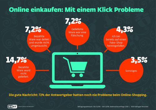 Die von ESET durchgeführte Online-Befragung unter 1.000 Verbrauchern in Deutschland zeigt, dass bereits viele Internetkunden die Schattenseite des Onlineeinkaufs kennengelernt haben. Jeder Siebte erhielt bereits bezahlte Ware nicht, 7,2 Prozent bekamen ein defektes Produkt, das sie nicht umtauschen konnten.