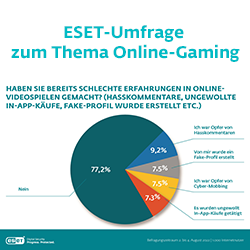 „Gaming ist keine Randerscheinung mehr und hat sich nach gesellschaftlich längst als Freizeitvergnügen über die Altersgrenzen hinweg etabliert. Das Fair-Play hier nicht an der Tagesordnung ist, belegt unsere aktuelle Studie“, so ESET Technologieexperte Michael Schröder. „Zudem haben Cyberkriminelle die möglichen finanziellen Gewinne im Blick und sind in der Gaming-Community aktiv. Mit Spam- und Phishing, aber auch mit gefälschten Apps zu beliebten Games, versuchen sie gezielt Gamer zu attackieren. Ob Android-Tablet oder -Smartphone, aber natürlich auch der Gaming-PC, eine Sicherheitslösung sollte mittlerweile zur Grundausstattung gehören, um persönliche Daten und Accounts vor Kriminellen zu schützen.“