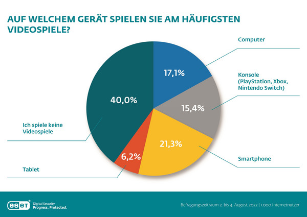 Rund 60 Prozent der Deutschen „zocken“ regelmäßig Videospiele wie beispielsweise Fortnite, Minecraft oder Fifa. Was früher der Gaming-PC war, ist heute für viele Gamer das Smartphone: 21 Prozent der befragten Gamer spielen von unterwegs. Mit rund 17 Prozent folgt der Computer und auf Platz drei landen mit etwas über 15 Prozent Spielekonsolen. Fair Play ist im Internet dabei nicht immer an der Tagesordnung: Fast 23 Prozent der befragten Gamer hatte bereits schlechte Erfahrungen in Form von Mobbing, Fake-Profilen oder Hasskommentaren machen müssen. Erfreulich ist das hohe Sicherheitsbewusstsein: Jeder Vierte schützt seine Gaming-Accounts mittels Zwei-Faktor-Authentifizierung. Das ist ein Teil der Ergebnisse einer repräsentativen Umfrage von ESET unter 1.000 Internetnutzern, die ESET im Vorfeld der gamescom durchführt.
