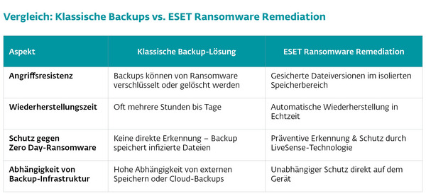 Hier kommt ESET Ransomware Remediation (RR) ins Spiel: Eine Lösung, die Prävention und Wiederherstellung kombiniert und Unternehmen eine automatische, geschützte Notfall-Backup-Funktion bietet.