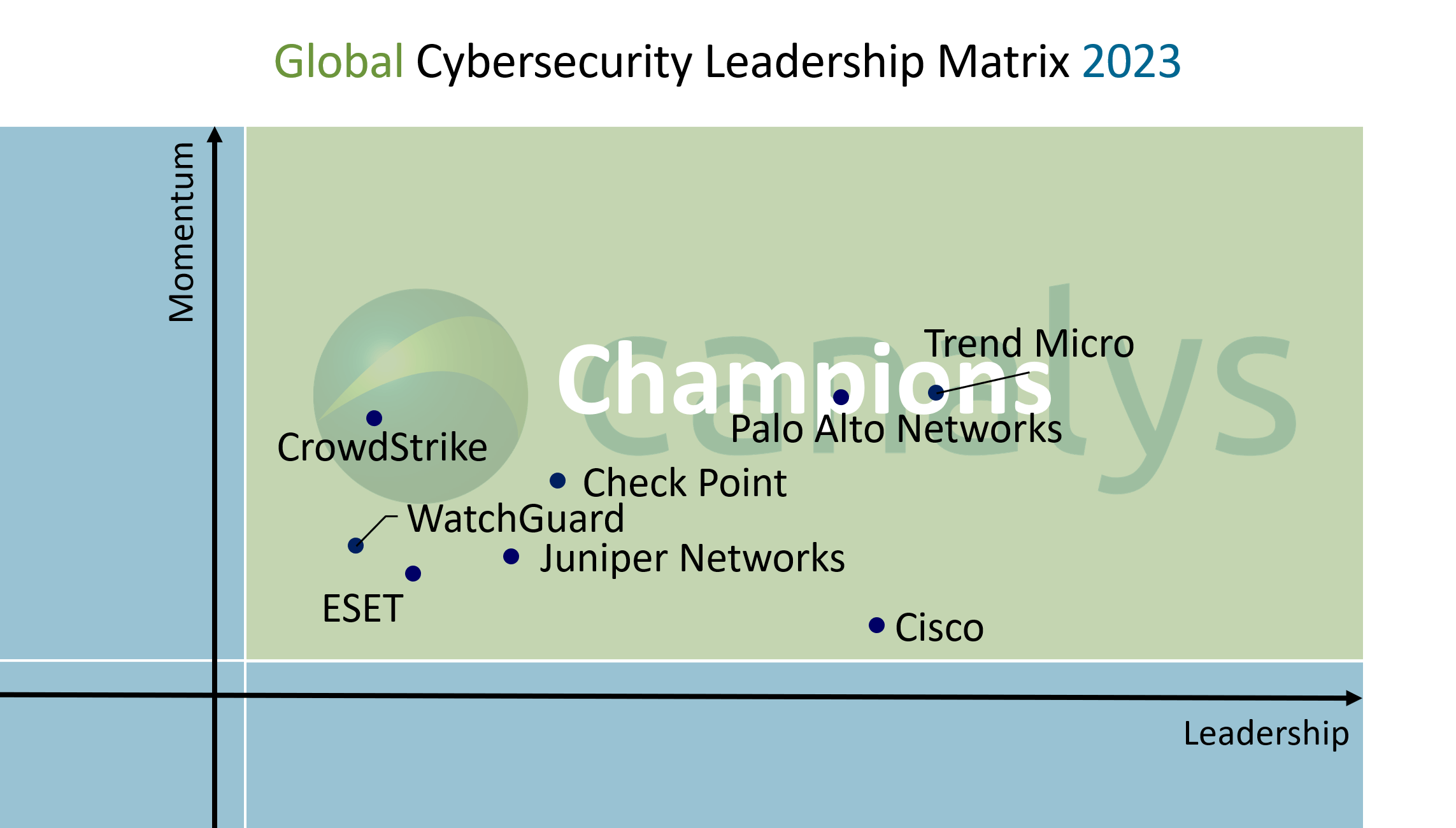 La matriz de liderazgo en ciberseguridad 2023 de Canalys reconoce que los puntos fuertes clave de ESET incluyen: