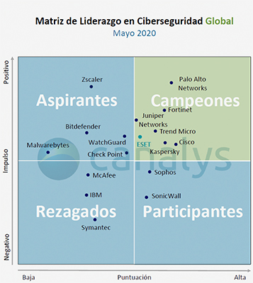 Obtén tu copia gratuita de la Matriz de Liderazgo en Seguridad Cibernética de Canalys, y podrás consultar con detalle la evaluación a 17 proveedores del mercado y comprobar como ESET ha conseguido la posición de "Campeón" por haber demostrado un fuerte sentimiento de compromiso hacia su canal apoyado en una inversión continuada en los mercados a los que se dirige y ofreciendo recursos locales que dan soporte a sus socios especializados.