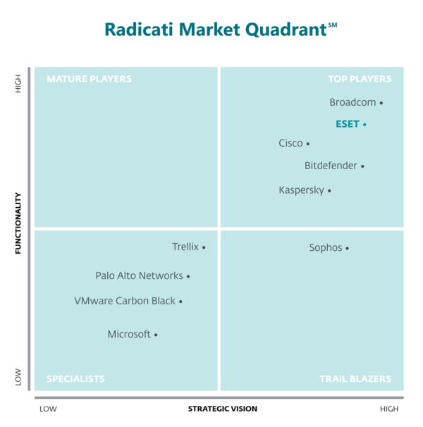 Los proveedores se posicionan en el cuadrante según dos criterios: funcionalidad y visión estratégica. Radicati define a los Top Players como los actuales líderes del mercado con productos que ofrecen tanto amplitud como profundidad de funcionalidad y poseen una sólida visión de futuro.