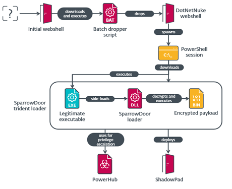 Pour accès initial au réseau, FamousSparrow a déployé un webshell sur un serveur IIS. Les victimes utilisaient des versions obsolètes de Windows Server et Microsoft Exchange vulnérables à plusieurs exploits. L'attaquant a combiné des outils personnalisés avec des logiciels malveillants partagés par d'autres groupes APT alignés sur la Chine, et des outils publics. Les charges finales incluaient SparrowDoor et ShadowPad, avec des plugins permettant d'exécuter des commandes, manipuler des fichiers, enregistrer des frappes de clavier, transférer des données, gérer des processus et capturer des écrans.