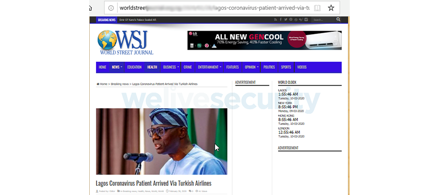 In another example, the phishing website below is attempting to impersonate the Wall Street Journal (WSJ) and is supposedly reporting the latest COVID-19 news. We have redacted some of the URL for obvious reasons, but notice that it starts with ‘worldstreet’ and the wording on the webpage states ‘world street’.