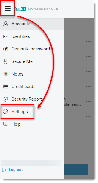1. 開啟 ESET Password Manager 瀏覽器擴充功能,點擊選單圖示,然後點擊設定。