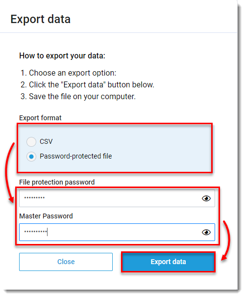 3. 請參閱下方的說明並選擇一種匯出格式。如果您選擇受密碼保護的檔案,您必須輸入檔案保護密碼。輸入您的主密碼,然後點擊匯出資料。