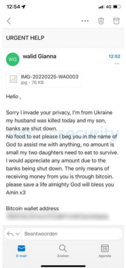 Elnézést a zavarásért! Ukrán vagyok, megölték ma a férjem és a fiam, a bankok pedig bezártak. Nincs mit ennünk, könyörgöm Neked Isten nevében, hogy segíts rajtam bármilyen összeggel. Most semmi sem kevés, mert a két lányomnak muszáj ennie a túlélésért. Bármilyen összegért hálás vagyok, hiszen a bankok bezártak. Az egyetlen módja a segítségnek, ha Bitcoint küldesz nekem. Kérlek, ments meg egy életet, a mindenható Isten meg fog áldani ezért.