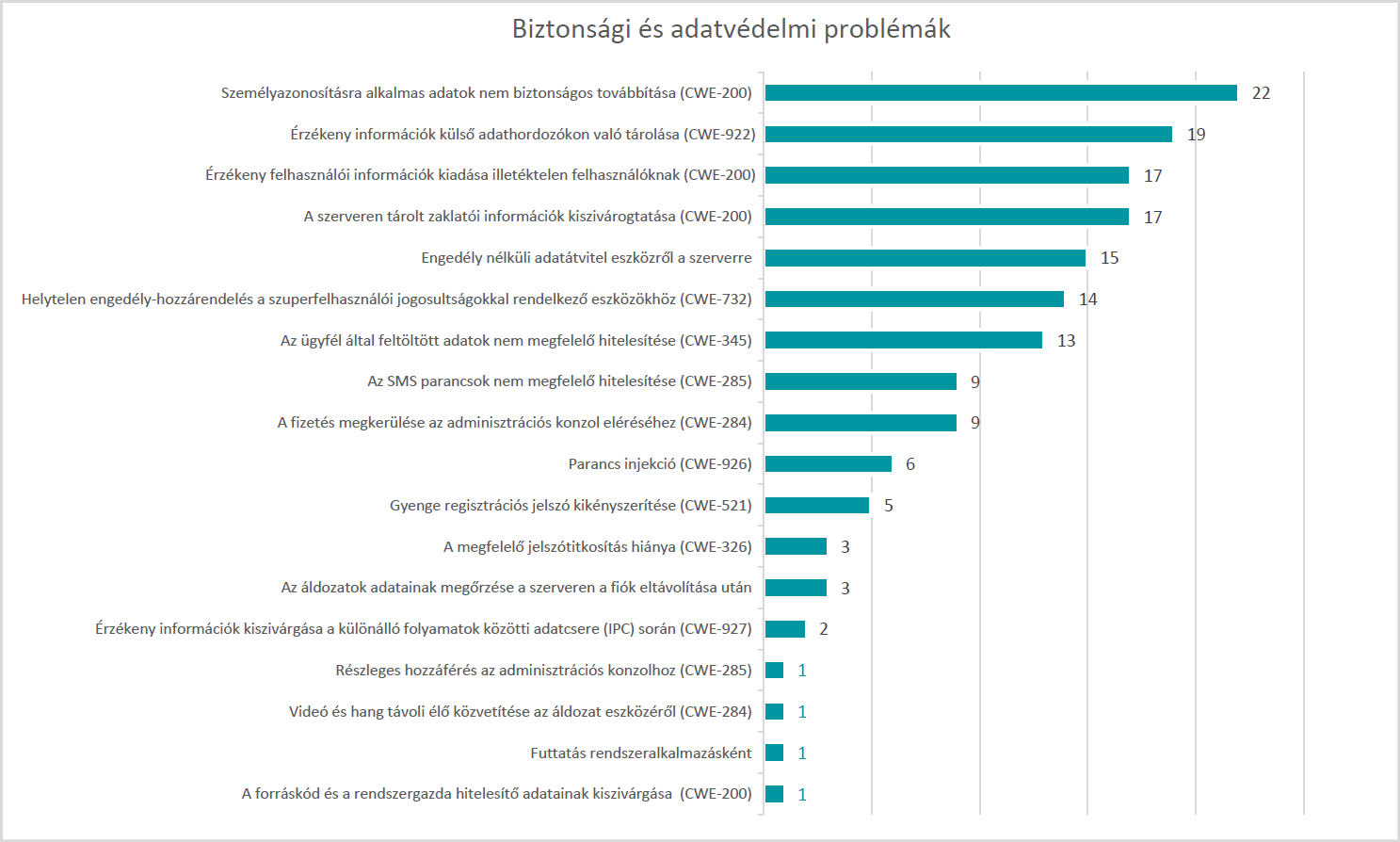 Az 58 Android-alkalmazás közül összesen 158 biztonsági és adatvédelmi problémát fedeztünk fel, amelyek komoly fenyegetést jelentenek nem csak az áldozatra nézve, de még a zaklató, sőt esetenként maga az alkalmazás gyártója is bizonyos mértékű kockázatnak van kitéve.
