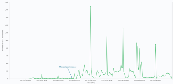 Óránkénti észlelésünk a CVE-2021-26855 nevű egyik Exchange biztonsági résen keresztül hozzáadott webshell kódokról