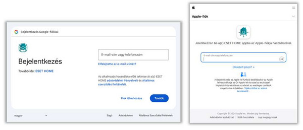 Adja meg a Google-fiókjának adatait vagy az Apple ID azonosítóját. Ekkor a rendszer belépteti az ESET HOME-fiókjába.