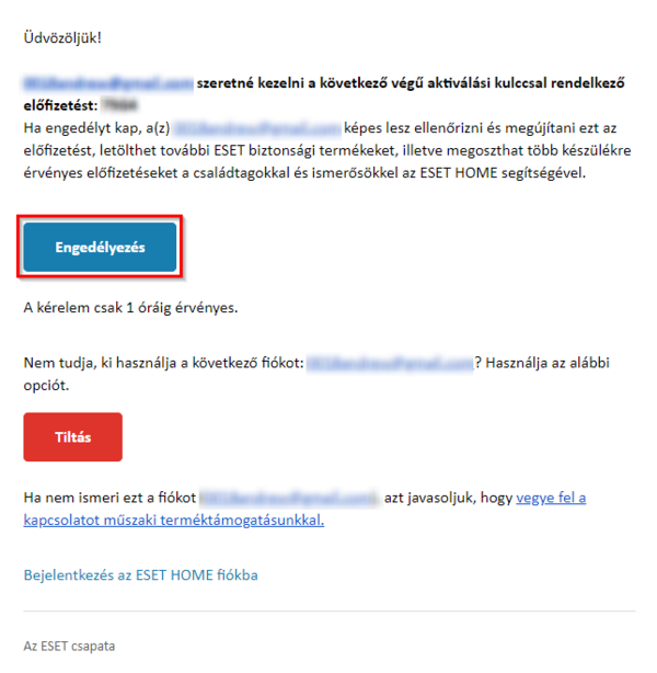 Az Előfizetés hozzáadásának befejezéséhez nyissa meg a vásárláskor megadott e-mail címéhez tartozó postafiókot, majd az ESET-től érkező Előfizetés igazolása tárgyú e-mailben kattintson az Engedélyezés gombra.