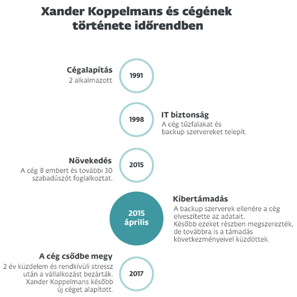 Xander Koppelmans 1991-ben alapította meg a cégét, mindössze két alkalmazottal a csapatában. „Szerettem volna a hobbimat hivatássá változtatni, és azzal foglalkozni, amit szeretek. Az álmomat éltem”- mondja a vállalkozó. Az üzlete sikeresen növekedett. „Még csak nem is kellett hirdetnünk a munkánkat. Elegendő volt az, hogy keményen dolgoztunk és remek kapcsolatot építettünk ki az ügyfeleinkkel. A kibertámadás történtekor összesen 90 futó projektünk volt, mintegy 400 aktív ügyfelünk, 8 alkalmazottunk és 30 szabadúszónk."