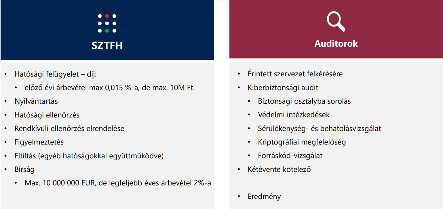 2024. évi LXIX. törvény előírja, hogy kiemelten kockázatos és kockázatos ágazatokban működő szolgáltatók és szervezetek (Forrás 2-3. számú mellékletek) kötelesek a kiberbiztonsági követelményeknek való megfelelés bizonyítására kétévente, illetve az illetékes kiberbiztonsági hatóság általi elrendelés esetén kiberbiztonsági auditot végeztetni.