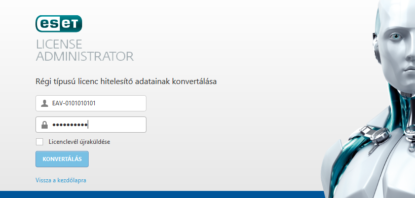 A legújabb, 6-os verziójú ESET megoldások aktiválásához és használatához a korábbi Felhasználónév és Jelszó helyett Licenckulcs szükséges. Az ELA portál segítségével hozzájuthat Licenckulcsához és ELA jelszavához a Felhasználóneve és Jelszava átkonvertálásával.