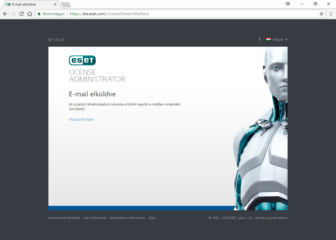 4. Az Ön egyedi Licenckulcsa megjelenik a következő oldalon. A megadott e-mail címre hamarosan érkezik egy levél, amely tartalmazni fogja az ESET License Administrator portálra való belépéshez szükséges adatokat (Licenckulcs, ELA jelszó). A belépéshez térjen vissza a kezdőlapra, az oldal alján található linkre kattintva.