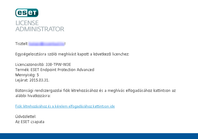 A harmadik félnek regisztrálnia szükséges az ESET License Administrator oldal „Biztonsági rendszergazdai fiók regisztrálása” részen. Belépés után a rendszergazdai fiókból kezdeményezhetik a licenc menedzselését a nyilvános licencazonosító megadásával, tehát a licenctulajdonosnak nem szükséges kiadnia sem az egyedi Licenckulcsát, sem a Felhasználónevét és Jelszavát a harmadik fél számára.