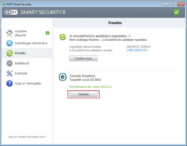 3. A telepített védelmi program pontos verziója megjelenik, és a program tájékoztatja, ha van elérhető újabb verzió. A telepítéshez nyomja meg a Telepítés gombot.