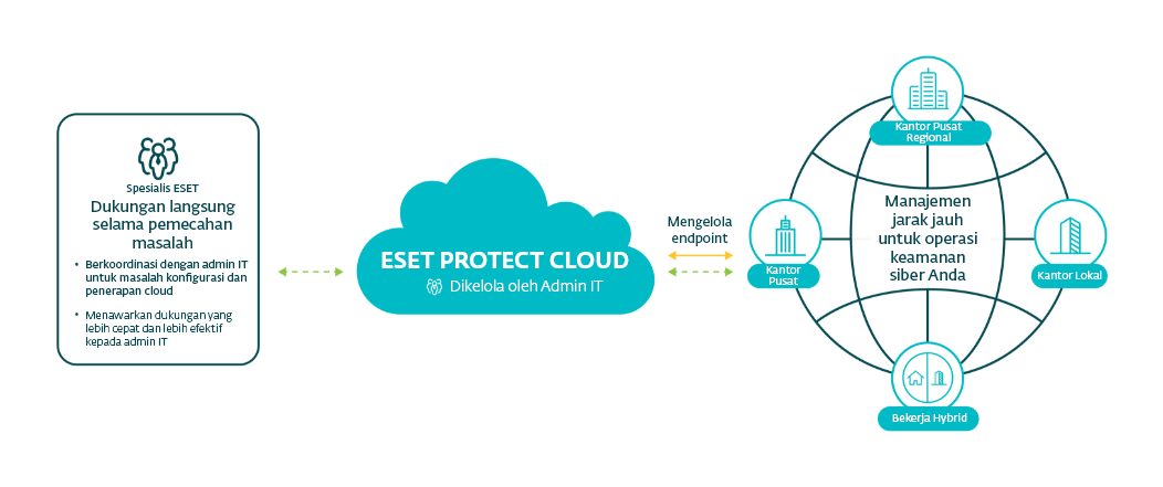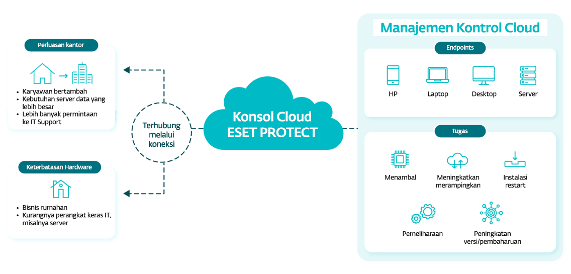 - ESET PROTECT Cloud beroperasi di lingkungan virtual dan tidak memerlukan perangkat keras fisik seperti server.