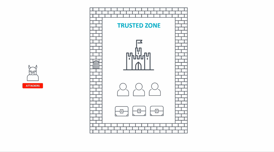 במודל האבטחה המסורתי, הארגון צריך להיות מוגן כמו מבצר עם תעלה חפורה מסביבו המייצגת את רשת הארגון. במערך כזה, קשה לקבל גישה למשאבים של ארגון מחוץ לרשת. יחד עם זאת, כל מי שנמצא בתוך הרשת נחשב לאמין כברירת מחדל. הבעיה בגישה זו היא שברגע שתוקף מקבל גישה לרשת, ובכך הופך לאמין כברירת מחדל, כל המשאבים של הארגון בסיכון עצום.