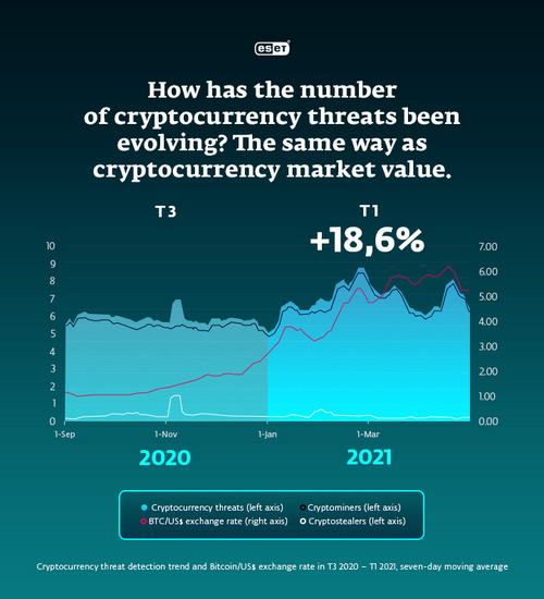 ככל שמטבעות דיגיטליים הופכים פופולריים יותר ובעלי ערך רב יותר, הלגיטימיות של תשלום במטבעות אלה מהמיינסטרים, מייצרת הזדמנויות לתוקפים. לא פלא שבין ינואר לאפריל 2021, מספר איומי המטבעות דיגיטליים עלו בכמעט 19%, חושף דו"ח האיומים של ESET