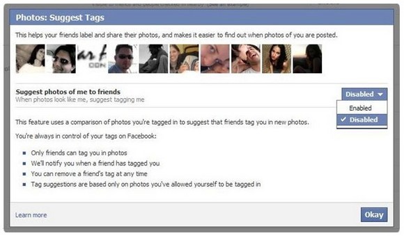 האופציה הבאה ברשימה קשורה לתיוג תמונות שלכם על ידי אחרים. פייסבוק משתמש במנגנון לזיהוי פנים והוא מציאת השם שלכם אוטומטית לחברים שמעלים תמונות שלכם. אם אתם לא מעוניינים שפייסבוק יזהה את הפנים שלכם בתמונות של חברים, תוכלו לנטרל את האופציה על ידי Edit Settings בשורה Suggest photos to my friends. בחלון שייפתח לחצו על Disable.