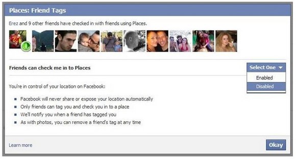 קיימת עוד אופציה שחשוב להכיר הקשורה לשירות Places ונקראת Check me in to places. אופציה זו מאפשר לפייסבוק לשתף את המיקום שלכם, כדי שתוכלו למצוא חברים בקרבת המקום בו אתם נמצאים. נשמע טוב? כל עוד אתם מסכימים לחשוף את המיקום בו אתם נמצאים. חבר שישתף את המיקום שלכם באמצעות Places למעשה חושף את המיקום שלכם לכולם, בין אתם רוצים בכך או לא. גם כאן אתם יכולים לבחור האם לשתף את החברים שלכם במיקום , או לא. בשורה Friends can check me in to place לחצו על edit setting ולפי בחירתכם נטרלו או הפעילו את האופציה ואשרו על ידי OK.