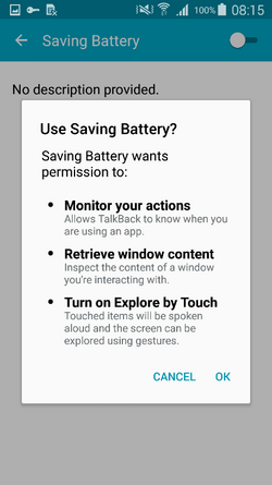 לאחר הורדת "עדכון" ה-Adobe Flash Player, מופיע מסך המתריע על "צריכת סוללה מוגברת" ודוחק במשתמש לעבור למצב מזויף של "חיסכון סוללה". כמו רוב הפופ אפים הזדוניים, ההודעה לא תפסיק לקפוץ עד שהמשתמש יסכים לקבלת השירות. פעולה זו פותחת את תפריט הנגישות במכשיר האנדרואיד, ומציגה רשימה של שירותים עם פונקציות הנגישות. בין האפשרויות המובנות, מופיעה אופציה חדשה "חיסכון סוללה" (שנוצרה על ידי הנוזקה בעת ההתקנה). לאחר מכן נפתח מסך המסביר שעל מנת לעבור למצב "חיסכון סוללה" יש לאפשר מספר הרשאות שבהמשך יאפשרו לתוקפים לשלוט מרחוק בפעולות הנעשות במכשיר ללא ידיעתו של המשתמש.