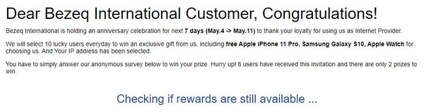 עשרה מאושרים שעלו בגורל, יוכלו לזכות בפרס לבחירתם – אייפון 11 פרו, גלקסי S10 או אפל וואטש: "כתובת ה-IP שלכם נבחרה, אנא הזדרזו כי שמונה זוכים כבר אספו את הפרס שלהם ורק שניים נותרו".