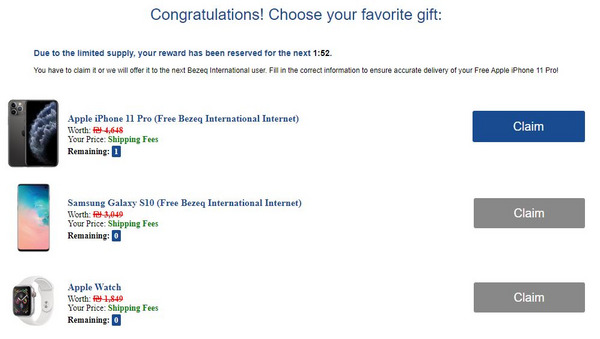 לאחר מענה על הסקר, נערכת בדיקה שמראה כי נותר רק אייפון 11 פרו לבחירת הזוכה וכי יש לו מספר דקות בודדות על מנת לאסוף את הפרס ולזכות בו.