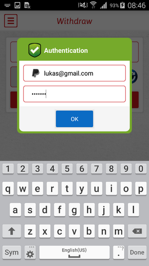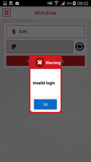 לאחר שנצברו $ 0.09 במהלך 16 שעות של צפייה בתוכן לאחר שראו החוקרים שאין שום אזכור לסף מינימום לתשלום, ניסו החוקרים למשוך את הסכום שנצבר. על מנת למשוך את הכסף, יש להזין תחילה את פרטי הכניסה של PayPal בטופס התחברות לא מאובטח עבור "אימות". לאחר שהמשתמשים מזינים את הפרטים שלהם, הם מקבלים הודעת שגיאה "התחברות לא חוקית" ופרטי ה- PayPal נשלחים ללא הצפנה לשרת של המפתחים.