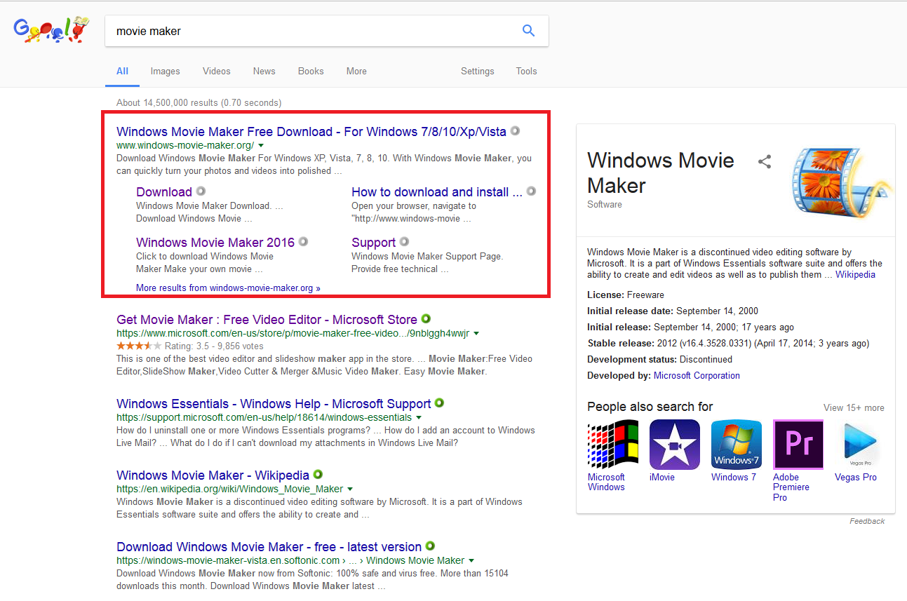 בחיפוש בגוגל של המונח "Movie Maker" מתקבלת התוצאה האורגנית הראשונה (לא ממומנת), שמובילה לאתר תרמית שממנו ניתן להוריד את התוכנה.