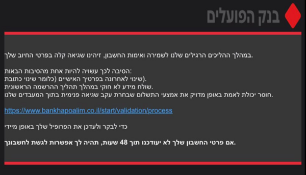ניתן לראות כי בניסוח כושל (אשר אמור להדליק אצלנו נורה אדומה), מציינים כי "כדי לבקר ולעדכן את הפרופיל באופן מיידי, אם פרטי החשבון שלך לא יעודכנו תוך 48 שעות, תהיה לך אפשרות לגשת לחשבונך". כלומר מבקשים מהנמענים לגשת לקישור ולעדכן את הפרטים.